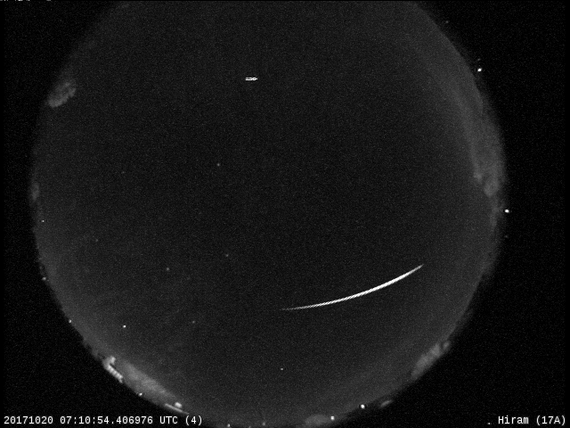 A Grand Orionid Fireball Meteor Imaged over Hiram Friday, October 20. Credit: NASA/All-Sky Fireball NetworkEarth is entering a stream of debris from Halley’s Comet, source of the annual Orionid meteor shower. Thursday night, NASA’s network of all-sky meteor cameras detected 23 Orionid fireballs over the USA –meteors that flare brighter than the planet Venus shines– a result of comet dust hitting the atmosphere at speeds exceeding 65 km/s (145,000 mph). Among several fireballs recorded by the Fireball Network camera on the Hiram campus was the grand meteoric streak pictured above; that fireball was also recorded by the camera located at the Allegheny Observatory in Pittsburgh in the wee hours of Friday morning. Forecasters expect the shower to peak on Oct. 21-22 with as many as 25 meteors per hour. The meteor shower is called “Orionid” because the “falling stars” appear to originate from the vicinity of our sky occupied constellation Orion. Visit Spaceweather.com for observing tips and sky maps. — From a report by Spaceweather.com plus local contribution.