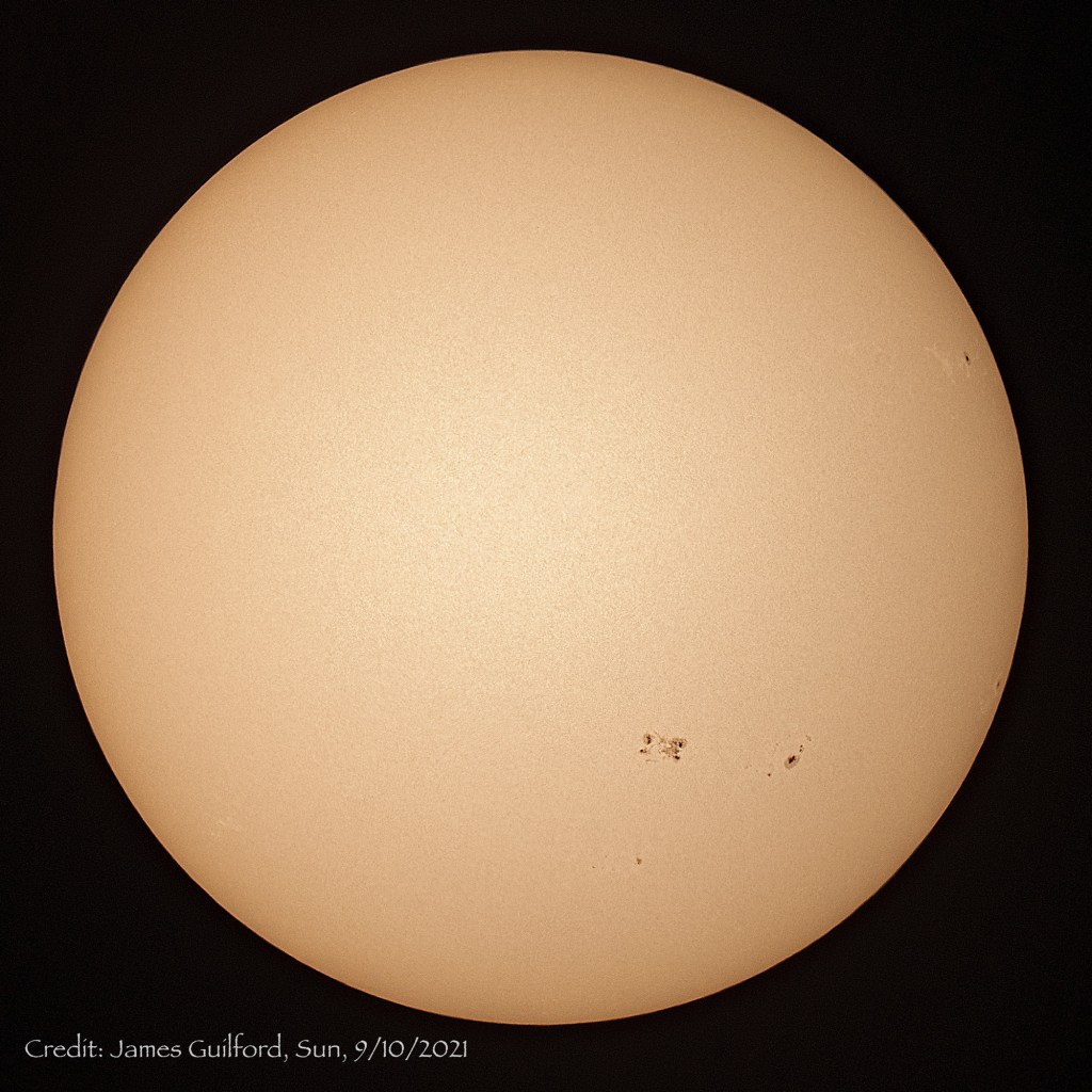 Here are two photos of Sun, shot by Stephens’ Director James Guilford, at 3:43 PM EDT (7:43 PM UTC). The first image shows the full solar disk. Notice not only the dark sunspots but also the lighter-colored “splotches” of additional active solar regions, most visible near the edges of the disk.