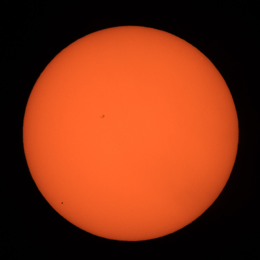 Mercury’s Transit in Progress: Mercury is the tiny dot at the lower-left. Smudge near the center is a group of sunspots. Photo by James Guilford.