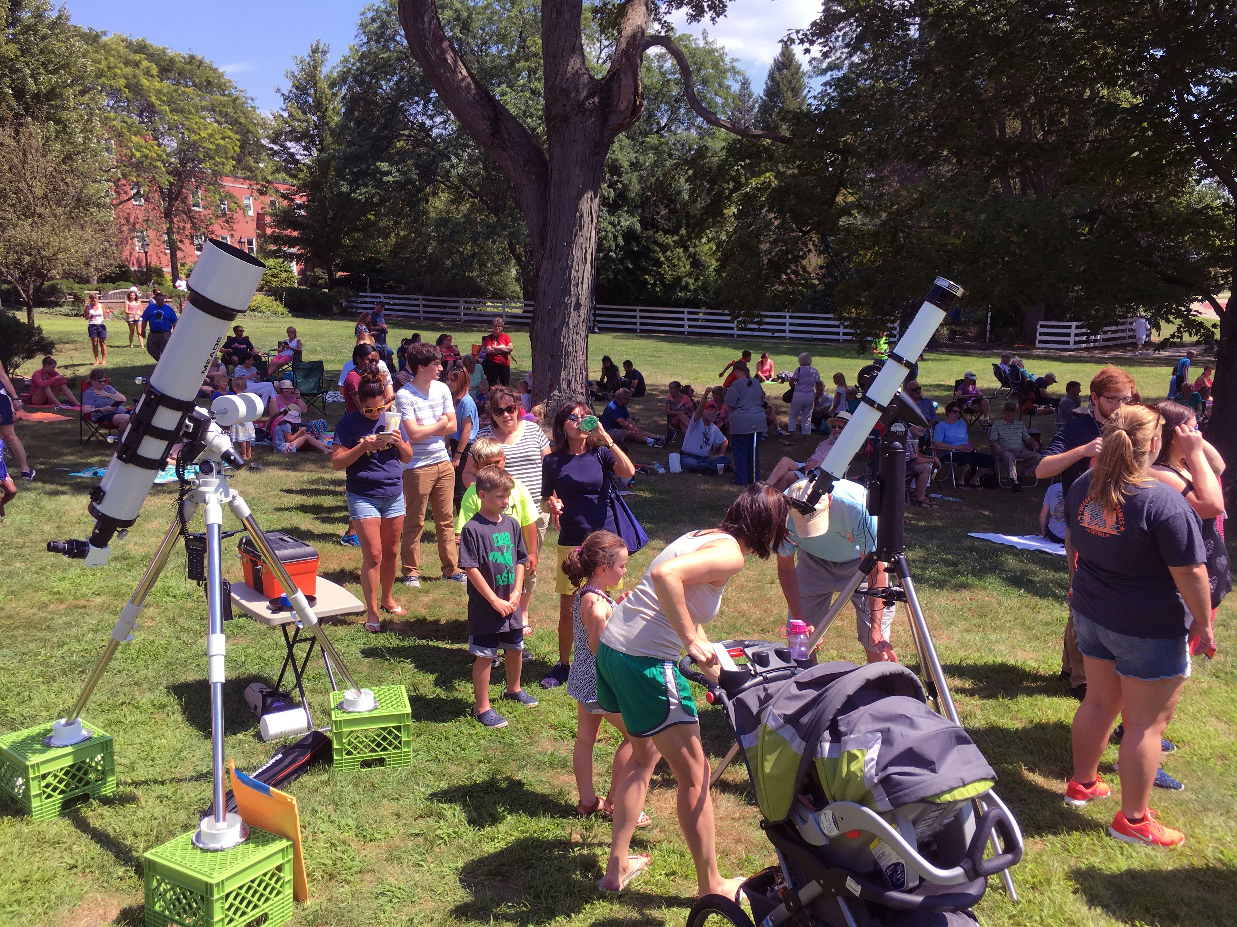 We estimate at least 375 people came to the campus lawn to share nature’s show and enjoy the sight together. Some families brought blankets and had picnic lunch in the shade of trees while waiting for the eclipse to begin. Driven by media reports, demand for Sun-safe eclipse viewing glasses was tremendous. Hiram had 300 eclipse viewers available for free distribution and even with restriction to one viewer per family or group, we ran out of glasses long before the eclipse ended. The offer of free eclipse glasses did, however, encourage some of our attendees to come out to Hiram College and discover there was more to enjoy than a giveaway; the view through our telescopes was tremendous.